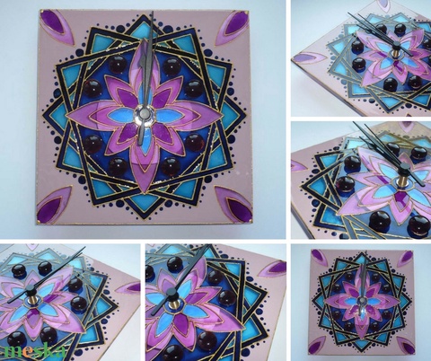 - Anyaga: üveg óralap, óraszerkezet, oldószeres üvegfesték, üvegkontúr, üvegkavics