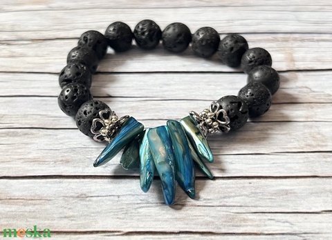 - Anyaga: gumis damil, türkinit, ezüst szerelék, teklagyöngy, kagyló