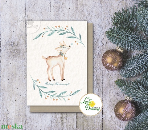 Őzikés Karácsonyi Képeslap, Adventi Képeslap, Karácsonyi, Karácsonyi üdvözlőlap, Ünnepi képeslap, őz, szarvas