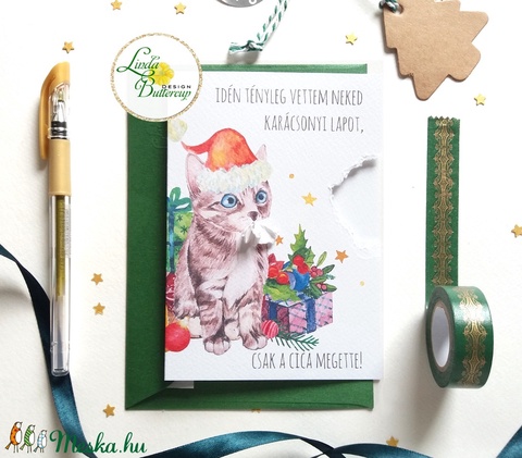 Karácsonyi Képeslap, Vicces, Humoros, Cicás, Cica, Macska, egyedi, Adventi Képeslap, Karácsonyi, Karácsonyi üdvözlőlap