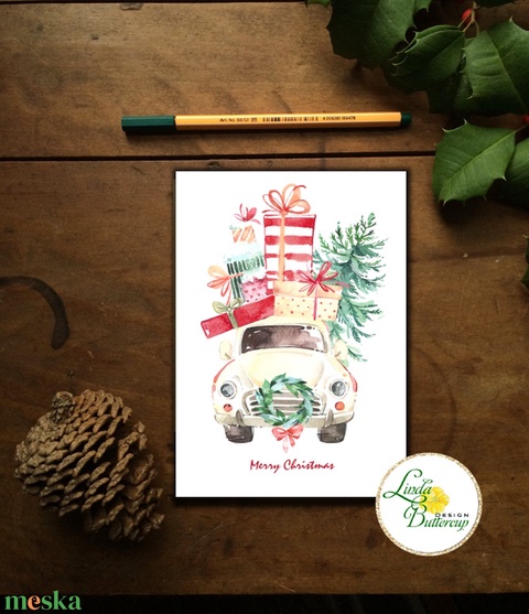 Autós Karácsonyi Képeslap, Retro, auto, bogár, fenyő, adventi Kártya, Vintage Karácsonyi üdvözlőlap, Vintage, fenyőfa