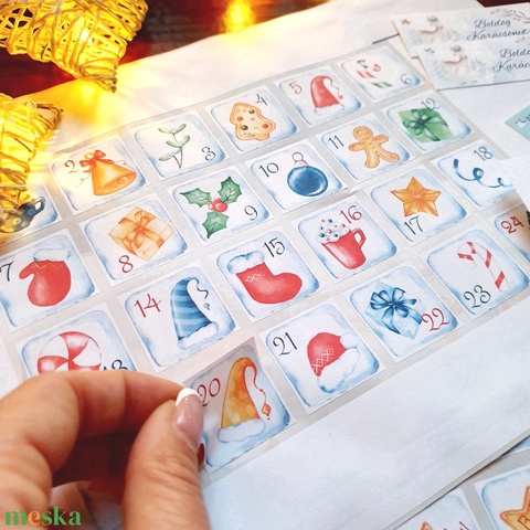 Színes Adventi naptár matrica, adventi kalendár, karácsonyi matrica, karácsonyi csomagolás, ajándékkísérő
