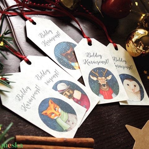 Állatos Karácsonyi Ajándékkísérő, erdei állat, Ünnepi kiskártya, ajándék, minimál design, szarvas, róka, maci, bagoly