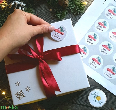 MATRICA, 20db, piros autó, fenyő, körmatrica, kör, címke, Karácsonyi Ajándékkísérő, cédula, vignetta, levonó, sticker