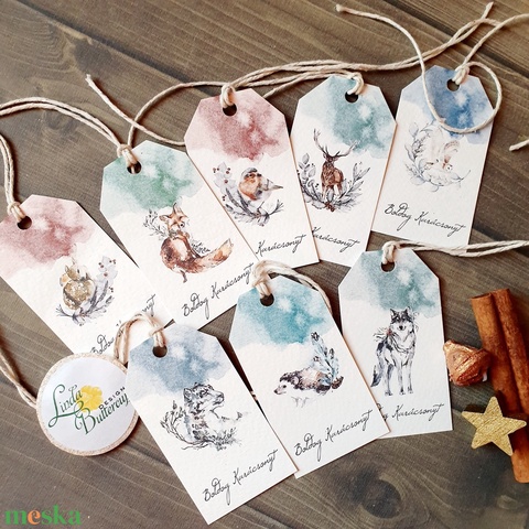 8db erdeiállatos ajándékkísérő, művészpapíron, lyukasztva zsineggel kötve