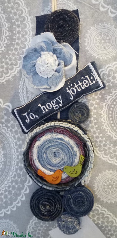 - Anyaga: textilvirág, textil, farmer, fa madár, zsinór