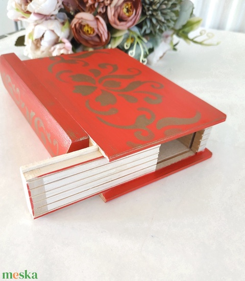 Titkok őre- könyv formájú puzzle doboz(piros-antik bronz tulipán)