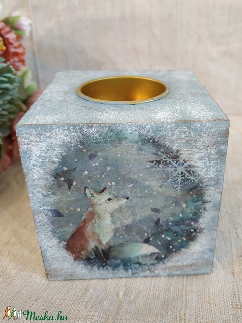 Róka szarvas hópehely Karácsonyi mécsestartó vintage stílus fehér kék