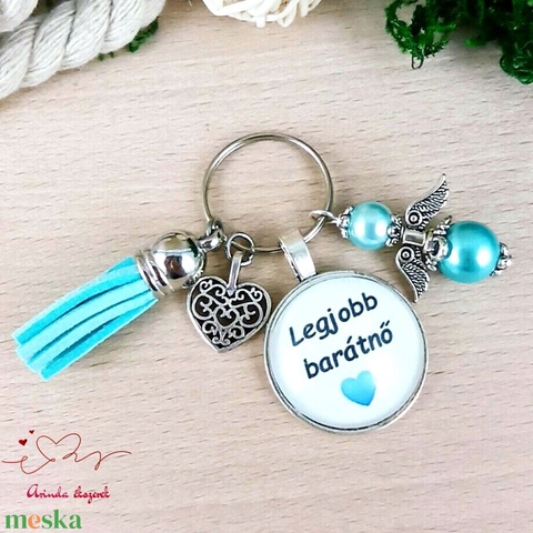 Legjobb barátnő feliratos üveglencsés kulcstartó táskadísz kék angyallal és bojttal