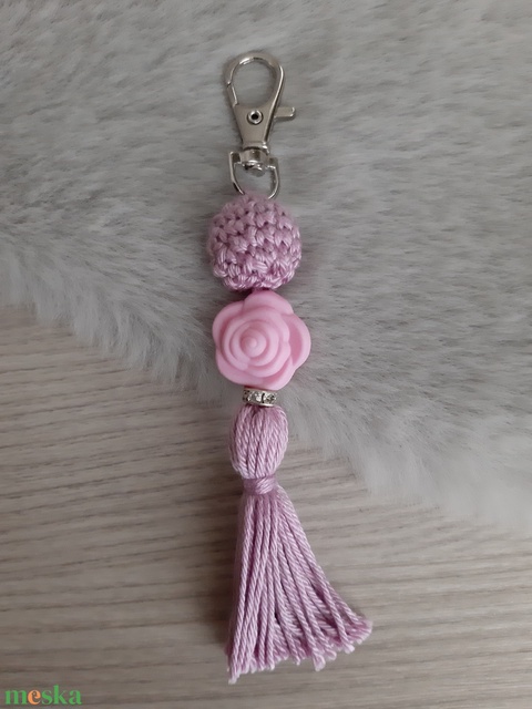 - Anyaga: karabíner, 100% pamut babafonal, fagolyó, szilikon gyöngy, csillogós spacer