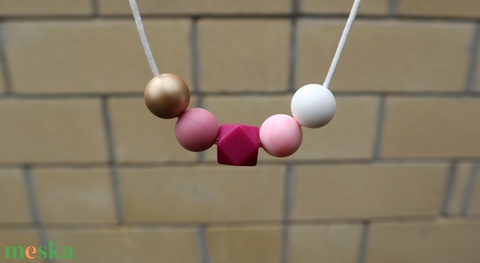 szilikon gyöngy, szatén zsinór, műanyag csat