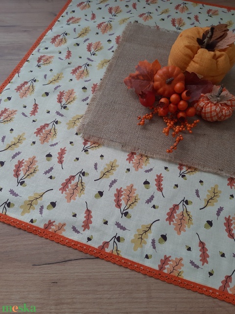 Őszi terítő, asztalközép pamutcsipkével - őszi levelek, halványsárga alapon