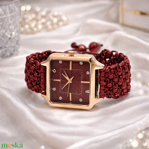 Borvörös makramé karóra négyszögletes számlappal