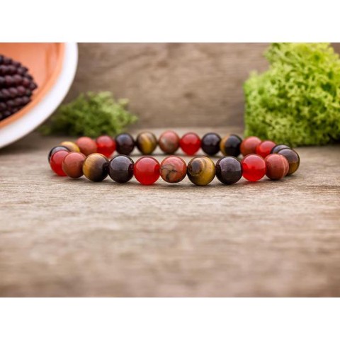 Ezt a szerencsehozó karkötőt kifejezetten az ikrek jegy szülötteinek terveztük, készítettük. A karkötő ikrek (05.21. - 06.21.) jegyhez passzoló gránát, karneol, tigrisszem és jáspis 8mm-es ásvány gyöngyökből áll. Az ásvány golyók gumira vannak felfűzve, így kényelmes a hordása.Ikrek (05.21. - 06.21.) horoszkóp jellemzése: E jegy szülöttje nyugtalan, mozgékony, gyors észjárású, és jó felfogóképességgel rendelkezik. Gyorsan és könnyen tanul, hatalmas tudásszomjjal rendelkezik. Állandó mozgásban van, szereti a változatosságot, a kalandot, és nagyon rugalmas természetű. Segítőkész, jószívű, és szívesen hoz áldozatot a környezetében élőkért. Ezek ellenére mégis – olykor – határozatlan, és nehezen éli meg a kudarcokat, könnyen eshet depresszióba. Nagyon érzékeny, és labilis idegzetű, ezért a kitartó, nehéz munkára nem alkalmas. Hangulata gyakran változik, és itt találjuk magunkat szembe azzal a ténnyel, hogy az Ikrek szimbóluma végül is egy ikerpár. Egyik pillanatban ugyanis még vidám, és felszabadult, a másikban pedig már szomorú, és lehangolt, mintha két személy versengene benne. Élete során nagyon sok mindennel megpróbálkozik, mivel képtelen kitartani egy cél mellett. Felületes, gyorsan hoz döntéseket, és ezért sokszor elhamarkodottan cselekszik. Mindig jót akar, könnyen köt ismeretségeket, az őszinteséget azonban gyakran már-már túlzásba viszi. Az Ikrek lételeme a kommunikáció, ezért nem tud barátok, és partner nélkül létezni, nagyon fontos számára, hogy beszélgetni tudjon. A változatosság szeretete miatt nagyon nehezen marad meg egy kapcsolatban, általában pont a kíváncsiság az, ami továbbhajtja. A karkötő ásványainak hatásáról az alábbiakban olvashatsz röviden:Gránát hatása: A gránát bizalmat és tartást ad reményt és bizakodást önt belénk. Az önbizalmunkkal együtt megnő a tenni akarásunk, az energiánk és bátorságunk, így enyhébb depresszió ellen is hatásos. A gránát a második világháború után jött újra divatba, aminek persze jó oka van. A gránát egy olyan kő, amely az energiablokádokkal, a fájdalmas és kellemetlen élményekkel jól elbánik. A gránát használója nem kerülheti el ezeknek a dolgoknak a feltárását és a velük való szembenézést, amely folyamat során a gránát komoly segítség lehet.Karneol hatása: Ez a kő magabiztosságot, merészséget, kezdeményezőkészséget és nyitottságot reprezentál. Segít abban, hogy környezetében otthonosan és kényelmesen érezze magát az ember. Növeli a motiváltságunkat. Segít nagyobb sikereket elérni karrierünkben, és személyes ügyeinkben, mivel erősítik a belső indíttatásainkat.Tigrisszem hatása: Az ásvány nevében minden benne van, amit spirituális síkon nyújtani tud. Elősegíti a "tiszta" szemmel látást, segít, hogy magunkat és a körülöttünk lévő világot perspektivikusabban lássuk, ennek köszönhetően figyelmesebben tekintsünk környezetünkre. Ezzel a fokozott megfigyelési képességgel könnyebben tudunk döntéseket hozni és problémákat megoldani. Azoknak az embereknek, akik nehezen hoznak döntéseket, kitűnő választás ez a kő. Ebből a tulajdonságából fakadóan nagyon jól használható a kő tanulmányaink során, vizsgák alkalmával, vagy amikor hirtelen gyors döntéseket kell meghoznunk. A tigrisszem megfékezi a túláradó energiákat, izgalmakat, melynek helyét mélységes belső béke és védettség érzete veszi át.Jáspis hatása: Valószínűleg a vörösesbarna jáspis a legismertebb, amelyet vörös jáspisnak neveznek. Színe aktiválja akaratunkat, bátorságunkat és kitartásunkat. Régi hagyomány szerint a jáspist minden kő anyjaként kezelték, amely a föld elemi erejét, bölcsességét és mindent átfogó türelmes szeretetét közvetíti. Egyszerű erős rezgése és tisztító energiája szerénységre és önzetlenségre, együttérzésre, megértésre és türelemre késztet, fejleszti természetes törekvésünket, hogy jót tegyünk.Az ásványok hatását nem befolyásolja, hogy ha eltérő a horoszkópod. A karkötőt nyugodtan hordhatja más jegy szülötte is. Bízz a megérzéseidben! Mindig azt az ásványt válaszd, ami a legjobban vonz!Az ásványok árnyalatai minimálisan eltérhetnek a képen láthatótól, hiszen természetes anyagok, és nincs két tökéletesen egyforma belőlük. Csuklóméretenként a karkötőben található ásványok darabszáma eltérhet a képen láthatótól. Figyelem! Az ásványokat, kristályokat az őskor óta használják a test, a lélek és az érzelmek harmonizálására. Az ókori kultúrákban kifejezetten elterjedtek voltak. Az évezredek alatt számtalan tudás és tapasztalat gyűlt össze róluk. Ásvány ékszereink leírásánál a meghatározó szakirodalom alapján készült összegzések olvashatók. Fontos! Az ásvány ékszerek viselése, az ásványok és kristályok gyógyításban, alternatív terápiaként való használata nem helyettesíti a modern orvostudományt, a gyógyszeres kezelést. Betegség esetén az öngyógyítás helyett kérjük, forduljon szakemberhez!