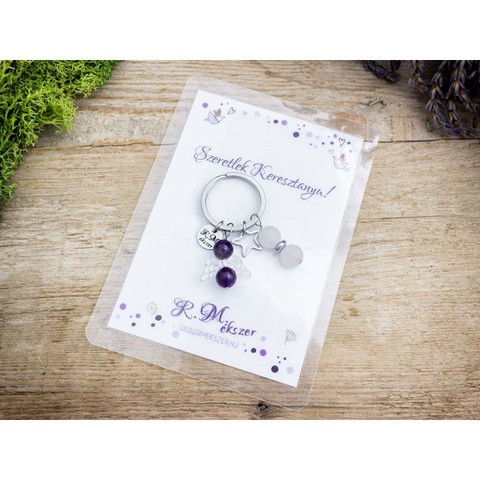 A számotokra állítottunk össze egy kedves meglepetést!Pótanyuka, akinek a feladata a nagymamához hasonlóan a kényeztetés. Ugyanakkor erős kötelék, akihez nagyobbacska korban is bátran lehet tanácsért fordulni. Kiváló ajándék lehet keresztelőre, vagy bármikor, amikor elmondanád, fontos neked. A kulcstartót a kártyával együtt kapjátok meg!A köszönő csomag tartalma: 1 db ametiszt, rózsakvarc díszes kulcstartó 1 db köszönő kártyaA laminált kívánság kártya mérete 110×80 mm. Figyelem! Az ásványokat, kristályokat az őskor óta használják a test, a lélek és az érzelmek harmonizálására. Az ókori kultúrákban kifejezetten elterjedtek voltak. Az évezredek alatt számtalan tudás és tapasztalat gyűlt össze róluk. Ásvány ékszereink leírásánál a meghatározó szakirodalom alapján készült összegzések olvashatók. Fontos! Az ásvány ékszerek viselése, az ásványok és kristályok gyógyításban, alternatív terápiaként való használata nem helyettesíti a modern orvostudományt, a gyógyszeres kezelést. Betegség esetén az öngyógyítás helyett kérjük, forduljon szakemberhez!