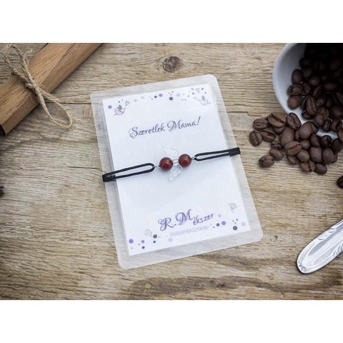 A számotokra állítottunk össze egy kedves ajándékot, szeretettel! A karkötőt a kártyával együtt kapjátok meg!​A köszönő csomag tartalma: 1 db karkötő 1 db köszönő kártya Ez a karkötő remek meglepetés lehet bárkinek, akit szeretnél megajándékozni. A laminált kívánság kártya mérete 110×80 mm.Az angyalok szerint, ha mindenki megtanulna kérdések, kételyek nélkül bízni az ösztöneiben, a világ sokkal békésebb hely lehetne. Bízz magadban, és válaszd ki saját védőangyal vagy segítő angyalodat! A megérzés útba igazító, és nem megmagyarázó rendszer. Tanulj meg tehát bízni az ösztöneidben anélkül, hogy mindig keresnéd a magyarázatokat, a visszaigazolást.Ez a karkötőnk tökéletesen antiallergén, így fémre érzékenyeknek is bátran ajánljuk.A medál mérete: 28×20 mm. A valódi ásvány angyal medál fém akasztó részét acélból / orvosi fémből készítettük. Az angyalka szárnya akrillból készült. Az angyalka fejét, és testét valódi 8 mm-es karneol ásvány gyöngyök alkotják.A karkötő microcord zsinóros kivitelének köszönhetően minden méretű csuklón kényelmes viselet. Speciális csúszócsomók segítségével van elkötve a zsinór, így méretre tudod igazítani. Fontos, hogy óvatosan húzd a zsineget a csomókon keresztül.A karkötő 14, és 20 cm-es csuklóméret között állítható. A microcord zsinór nagyon tartós, és könnyű nylon anyag, átmérője 1,7 mm. Amit a karneolról érdemes tudnod: Színe a narancssárgától a sötét-barnás pirosig terjedhet. Nevét a narancsos-piros Kornel (Kornél) cseresznyéről kapta. Lelki gyógyhatás: Ez a kő magabiztosságot, merészséget, kezdeményezőkészséget és nyitottságot reprezentál. Segít abban, hogy környezetében otthonosan és kényelmesen érezze magát az ember. Növeli a motiváltságunkat. Segít nagyobb sikereket elérni karrierünkben, és személyes ügyeinkben, mivel erősítik a belső indíttatásainkat. Testi gyógyhatás: Hatásos gyomor és mindenféle bélbetegség ellen, mint pl. bélgyulladás, szorulás, bélgörcsök, bélflóra-szabályozás esetében. Hat a vérre, az azzal kapcsolatos problémákra, javítja a vérképet, oldja a vérrögöket, segít elállítani a vérzést. Használhatjuk anyagcsere problémák esetében is, javítja a szervezet ásványi- és tápanyag felvételét. A karneol segít a vese- és hólyagkövek feloldásában. Kitűnően használható az un. "női" betegségeknél, mint a petefészek problémák, petefészek gyulladás, petefészek daganatok, fájdalmas havi vérzés, altesti fájdalmak, miómák, ciszták és egyéb gyulladások esetén. A karneol csökkenti a koleszterinszintet is. Hatással van a lépre, a májra, a gyomorra és a nyirokérrendszerre. Feszesebbé teszi a kötőszövetet, jól hat érfájdalmak és visszér esetében. Csalánkiütés ellen is hatásos. Hozzárendelt mágikus hatás:  A karneolt használhatjuk otthonunkban tűz ellen, illetve szerencsétlenség elleni talizmánként. Csillagjegyei: Kos, Bika, Ikrek, Oroszlán, Szűz, Vízöntő Csakrái: Gyökércsakra - vörös karneol, Szakrális csakra- sárga karneol   Figyelem! Az ásványokat, kristályokat az őskor óta használják a test, a lélek és az érzelmek harmonizálására. Az ókori kultúrákban kifejezetten elterjedtek voltak. Az évezredek alatt számtalan tudás és tapasztalat gyűlt össze róluk. Ásvány ékszereink leírásánál a meghatározó szakirodalom alapján készült összegzések olvashatók. Fontos! Az ásvány ékszerek viselése, az ásványok és kristályok gyógyításban, alternatív terápiaként való használata nem helyettesíti a modern orvostudományt, a gyógyszeres kezelést. Betegség esetén az öngyógyítás helyett kérjük, forduljon szakemberhez!
