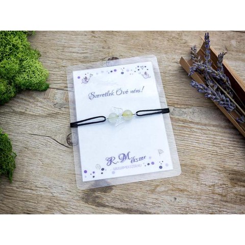 A számotokra állítottunk össze egy kedves ajándékot, szeretettel! A karkötőt a kártyával együtt kapjátok meg!​A köszönő csomag tartalma: 1 db karkötő 1 db köszönő kártya Ez a karkötő remek meglepetés lehet bárkinek, akit szeretnél megajándékozni. A laminált kívánság kártya mérete 110×80 mm.Az angyalok szerint, ha mindenki megtanulna kérdések, kételyek nélkül bízni az ösztöneiben, a világ sokkal békésebb hely lehetne. Bízz magadban, és válaszd ki saját védőangyal vagy segítő angyalodat! A megérzés útba igazító, és nem megmagyarázó rendszer. Tanulj meg tehát bízni az ösztöneidben anélkül, hogy mindig keresnéd a magyarázatokat, a visszaigazolást.Ez a karkötőnk tökéletesen antiallergén, így fémre érzékenyeknek is bátran ajánljuk.A medál mérete: 28×20 mm. A valódi ásvány angyal medál fém akasztó részét acélból / orvosi fémből készítettük. Az angyalka szárnya akrillból készült. Az angyalka fejét, és testét valódi 8 mm-es citrin ásvány gyöngyök alkotják.A karkötő microcord zsinóros kivitelének köszönhetően minden méretű csuklón kényelmes viselet. Speciális csúszócsomók segítségével van elkötve a zsinór, így méretre tudod igazítani. Fontos, hogy óvatosan húzd a zsineget a csomókon keresztül.A karkötő 14, és 20 cm-es csuklóméret között állítható. A microcord zsinór nagyon tartós, és könnyű nylon anyag, átmérője 1,7 mm. Amit a citrinről érdemes tudnod:A citrin a sárgának szinte mindenféle színárnyalatát felvonultathatja. Az ásvány akkor keletkezik, amikor a kvarcot enyhe radioaktív sugárzás éri. Ritka kőről lévén szó, az értéke magas, gyakran árulnak hevített ametisztet citrin néven. Lelki gyógyhatása: A citrin védelmezi és megtisztítja auránkat, eltávolítja a negatív energiákat, pozitív, örömteli rezgéseket áraszt. A negatív érzelmeket átalakító hatásának köszönhetően segít a problematikus kapcsolatok helyrehozásában. Megteremti a frissesség és biztonság érzését. Erősíti az intuitív oldalunkat, a szellemi érzékenységünket, koncentrációt és tetterőt. Támogatja a rugalmas döntéshozatalt, és segítségével reálisabban felmérhetjük a valós helyzetet. A napfonat csakrára kifejtett hatása révén nyugalmat biztosít. Megértést és bölcsességet teremt, támogatja a bennünk rejlő örömöt és optimizmust. Motivációt ad és bölcsességet, hogy hibáinkból tanulhassunk. Segít elfogadni önmagunkat. Testi gyógyhatás: A citrin a gyomor és a belek problémáin segít. Ösztönzi az emésztőszervek és belső elválasztású mirigyek tevékenységét. Hatással van a hasnyálmirigyre is, így jó cukorbetegség ellen. Csökkenti a koleszterinszintet. Mivel segíti a méreganyagok kiválasztását, így használhatjuk méregtelenítő kúrák során. Hozzárendelt mágikus hatás:  Vonzza a gazdagságot és sikert. Csillagjegyei: Bika, Ikrek, Oroszlán, Szűz, Skorpió, Bak Csakrái: Napfonatcsakra, Torokcsakra   Figyelem! Az ásványokat, kristályokat az őskor óta használják a test, a lélek és az érzelmek harmonizálására. Az ókori kultúrákban kifejezetten elterjedtek voltak. Az évezredek alatt számtalan tudás és tapasztalat gyűlt össze róluk. Ásvány ékszereink leírásánál a meghatározó szakirodalom alapján készült összegzések olvashatók. Fontos! Az ásvány ékszerek viselése, az ásványok és kristályok gyógyításban, alternatív terápiaként való használata nem helyettesíti a modern orvostudományt, a gyógyszeres kezelést. Betegség esetén az öngyógyítás helyett kérjük, forduljon szakemberhez!