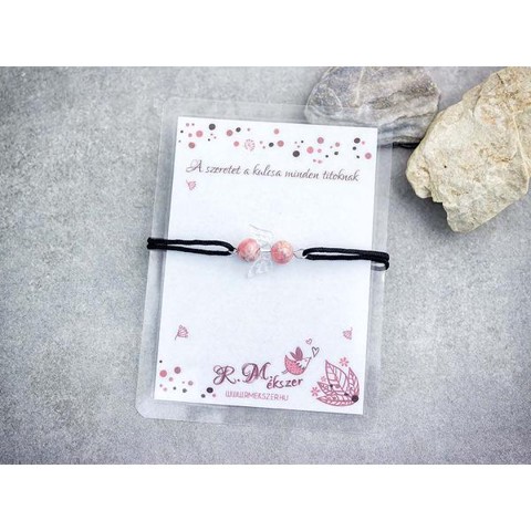A számotokra állítottunk össze egy kedves ajándékot, szeretettel! A karkötőt a kártyával együtt kapjátok meg!​A köszönő csomag tartalma: 1 db karkötő 1 db köszönő kártya Ez a karkötő remek meglepetés lehet bárkinek, akit szeretnél megajándékozni. A laminált kívánság kártya mérete 110×80 mm.Az angyalok szerint, ha mindenki megtanulna kérdések, kételyek nélkül bízni az ösztöneiben, a világ sokkal békésebb hely lehetne. Bízz magadban, és válaszd ki saját védőangyal vagy segítő angyalodat! A megérzés útba igazító, és nem megmagyarázó rendszer. Tanulj meg tehát bízni az ösztöneidben anélkül, hogy mindig keresnéd a magyarázatokat, a visszaigazolást.Ez a karkötőnk tökéletesen antiallergén, így fémre érzékenyeknek is bátran ajánljuk.A medál mérete: 28×20 mm. A valódi ásvány angyal medál fém akasztó részét acélból / orvosi fémből készítettük. Az angyalka szárnya akrillból készült. Az angyalka fejét, és testét valódi 8 mm-es rodokrozit ásvány gyöngyök alkotják.A karkötő microcord zsinóros kivitelének köszönhetően minden méretű csuklón kényelmes viselet. Speciális csúszócsomók segítségével van elkötve a zsinór, így méretre tudod igazítani. Fontos, hogy óvatosan húzd a zsineget a csomókon keresztül.A karkötő 14, és 20 cm-es csuklóméret között állítható. A microcord zsinór nagyon tartós, és könnyű nylon anyag, átmérője 1,7 mm.Amit a rodokrozitról érdemes tudnod:A rodokrozit egy karbonátásvány, a mangán-karbonát trigonális kristályrendszerű ásványa.Lelki gyógyhatása:Ha a rodokrozit belép az életembe, akkor eljött az ideje az önszeretetnek. Feltárja ebben való hiányosságaimat. Segítségével megtudhatom, amit tennem kell az önszeretet érdekében. Szeretetem révén közel kerülhetek önmagamhoz, sőt össze is olvadhatok saját magammal.Testi gyógyhatás:Enyhíti az asztmát és a légzési problémákat. Megtisztítja a keringési rendszert, veséket, helyreállítja a gyenge látást. Normalizálja a vérnyomást, stabilizálja a szívverést, erősíti az ivarszerveket. Tágítja a véredényeket, csillapítja a migrént.Csillagjegyei: Kos, Bika, Rák, Mérleg Skorpió, BakCsakrái: Szívcsakra, Koronacsakra  Figyelem! Az ásványokat, kristályokat az őskor óta használják a test, a lélek és az érzelmek harmonizálására. Az ókori kultúrákban kifejezetten elterjedtek voltak. Az évezredek alatt számtalan tudás és tapasztalat gyűlt össze róluk. Ásvány ékszereink leírásánál a meghatározó szakirodalom alapján készült összegzések olvashatók. Fontos! Az ásvány ékszerek viselése, az ásványok és kristályok gyógyításban, alternatív terápiaként való használata nem helyettesíti a modern orvostudományt, a gyógyszeres kezelést. Betegség esetén az öngyógyítás helyett kérjük, forduljon szakemberhez!