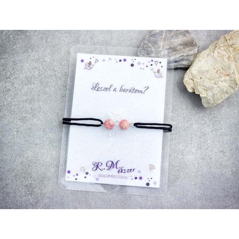 A számotokra állítottunk össze egy kedves ajándékot, szeretettel! A karkötőt a kártyával együtt kapjátok meg!A köszönő csomag tartalma: 1 db karkötő 1 db köszönő kártya Ez a karkötő remek meglepetés lehet bárkinek, akit szeretnél megajándékozni. A laminált kívánság kártya mérete 110×80 mm.Az angyalok szerint, ha mindenki megtanulna kérdések, kételyek nélkül bízni az ösztöneiben, a világ sokkal békésebb hely lehetne. Bízz magadban, és válaszd ki saját védőangyal vagy segítő angyalodat! A megérzés útba igazító, és nem megmagyarázó rendszer. Tanulj meg tehát bízni az ösztöneidben anélkül, hogy mindig keresnéd a magyarázatokat, a visszaigazolást.Ez a karkötőnk tökéletesen antiallergén, így fémre érzékenyeknek is bátran ajánljuk.A medál mérete: 28×20 mm. A valódi ásvány angyal medál fém akasztó részét acélból / orvosi fémből készítettük. Az angyalka szárnya akrillból készült. Az angyalka fejét, és testét valódi 8 mm-es rodokrozit ásvány gyöngyök alkotják.A karkötő microcord zsinóros kivitelének köszönhetően minden méretű csuklón kényelmes viselet. Speciális csúszócsomók segítségével van elkötve a zsinór, így méretre tudod igazítani. Fontos, hogy óvatosan húzd a zsineget a csomókon keresztül.A karkötő 14, és 20 cm-es csuklóméret között állítható. A microcord zsinór nagyon tartós, és könnyű nylon anyag, átmérője 1,7 mm.Amit a rodokrozitról érdemes tudnod:A rodokrozit egy karbonátásvány, a mangán-karbonát trigonális kristályrendszerű ásványa.Lelki gyógyhatása:Ha a rodokrozit belép az életembe, akkor eljött az ideje az önszeretetnek. Feltárja ebben való hiányosságaimat. Segítségével megtudhatom, amit tennem kell az önszeretet érdekében. Szeretetem révén közel kerülhetek önmagamhoz, sőt össze is olvadhatok saját magammal.Testi gyógyhatás:Enyhíti az asztmát és a légzési problémákat. Megtisztítja a keringési rendszert, veséket, helyreállítja a gyenge látást. Normalizálja a vérnyomást, stabilizálja a szívverést, erősíti az ivarszerveket. Tágítja a véredényeket, csillapítja a migrént.Csillagjegyei: Kos, Bika, Rák, Mérleg Skorpió, BakCsakrái: Szívcsakra, Koronacsakra Figyelem! Az ásványokat, kristályokat az őskor óta használják a test, a lélek és az érzelmek harmonizálására. Az ókori kultúrákban kifejezetten elterjedtek voltak. Az évezredek alatt számtalan tudás és tapasztalat gyűlt össze róluk. Ásvány ékszereink leírásánál a meghatározó szakirodalom alapján készült összegzések olvashatók. Fontos! Az ásvány ékszerek viselése, az ásványok és kristályok gyógyításban, alternatív terápiaként való használata nem helyettesíti a modern orvostudományt, a gyógyszeres kezelést. Betegség esetén az öngyógyítás helyett kérjük, forduljon szakemberhez!