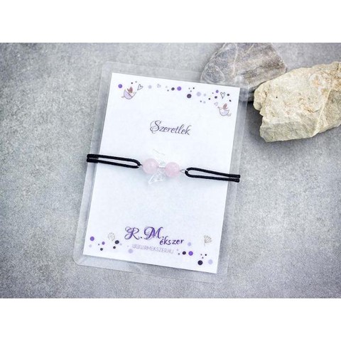 A számotokra állítottunk össze egy kedves ajándékot, szeretettel! A karkötőt a kártyával együtt kapjátok meg!​A köszönő csomag tartalma: 1 db karkötő 1 db köszönő kártya Ez a karkötő remek meglepetés lehet bárkinek, akit szeretnél megajándékozni. A laminált kívánság kártya mérete 110×80 mm.Az angyalok szerint, ha mindenki megtanulna kérdések, kételyek nélkül bízni az ösztöneiben, a világ sokkal békésebb hely lehetne. Bízz magadban, és válaszd ki saját védőangyal vagy segítő angyalodat! A megérzés útba igazító, és nem megmagyarázó rendszer. Tanulj meg tehát bízni az ösztöneidben anélkül, hogy mindig keresnéd a magyarázatokat, a visszaigazolást.Ez a karkötőnk tökéletesen antiallergén, így fémre érzékenyeknek is bátran ajánljuk.A medál mérete: 28×20 mm. A valódi ásvány angyal medál fém akasztó részét acélból / orvosi fémből készítettük. Az angyalka szárnya akrillból készült. Az angyalka fejét, és testét valódi 8 mm-es rózsakvarc ásvány gyöngyök alkotják.A karkötő microcord zsinóros kivitelének köszönhetően minden méretű csuklón kényelmes viselet. Speciális csúszócsomók segítségével van elkötve a zsinór, így méretre tudod igazítani. Fontos, hogy óvatosan húzd a zsineget a csomókon keresztül.A karkötő 14, és 20 cm-es csuklóméret között állítható. A microcord zsinór nagyon tartós, és könnyű nylon anyag, átmérője 1,7 mm. Amit a rózsakvarcról érdemes tudnod:A festetlen rózsakvarc az egész világos, szinte áttetszőtől, a ködös középrózsaszínig terjed. Az egyik legnépszerűbb kövek egyike, amely szépséges küllemének és erős gyógyhatásának köszönhető. Története a görög és római mitológiába nyúlik vissza, amely szerint a rózsakvarc Erósznak és Ámornak a szerelem Isteneinek az emberek felé nyújtott ajándéka.Lelki gyógyhatás: Már tehát az ókoriak is hittek a kő szerelem terén gyakorolt pozitív hatásaiban. A rózsakvarc a szívcsakrán keresztül segít az érzelmi blokádok feloldásában, megnyitja belső kapukat, hogy a csodát, szeretetet és szerelem formájában magunkévá tehessük. Érzelmi blokkok feloldása a szerelem lelki és testi kiteljesedését segíti. Az érzelmi gátak felszabadítása a termékenységet is magában hordozza, így ez a kő terméketlenség esetén is hasznos lehet. A rózsakvarc egyéb területeken is bizonyíthatja pozitív hatásait. Mivel segít megtalálni az életben a szépséget és a szeretet lelki egyensúlyunk helyre billentése és alkotó gondolatok megtalálása terén is hasznunkra lehet ez az ásvány. Használjuk meditáció közben haragunk leküzdéséhez és szeretetünk, szerelmünk kiteljesítéséhez.Testi gyógyhatás: Ez a rózsaszín különlegesség testi bajainkra gyógyírt jelenthet, mint a szívcsakra köve, a bőrbetegségek, asztma, allergia és vérszegénység ellen használhatjuk. Védi és erősíti a szívet, harmonizálja a szívritmust.Hozzárendelt mágikus hatás:Sokak szerint a rózsakvarc nem csak a már meglévő szerelmünk intenzívebbé tételében segíthet, hanem az áhított szerelem megtalálásában, magunkhoz vonzásában is.Csillagjegyei: Bika, Rák, MérlegCsakrái: Szívcsakra  Figyelem! Az ásványokat, kristályokat az őskor óta használják a test, a lélek és az érzelmek harmonizálására. Az ókori kultúrákban kifejezetten elterjedtek voltak. Az évezredek alatt számtalan tudás és tapasztalat gyűlt össze róluk. Ásvány ékszereink leírásánál a meghatározó szakirodalom alapján készült összegzések olvashatók. Fontos! Az ásvány ékszerek viselése, az ásványok és kristályok gyógyításban, alternatív terápiaként való használata nem helyettesíti a modern orvostudományt, a gyógyszeres kezelést. Betegség esetén az öngyógyítás helyett kérjük, forduljon szakemberhez!