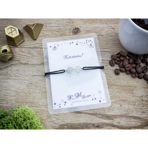 A számotokra állítottunk össze egy kedves ajándékot, szeretettel! A karkötőt a kártyával együtt kapjátok meg!​A köszönő csomag tartalma: 1 db karkötő 1 db köszönő kártya Ez a karkötő remek meglepetés lehet bárkinek, akit szeretnél megajándékozni. A laminált kívánság kártya mérete 110×80 mm.Az angyalok szerint, ha mindenki megtanulna kérdések, kételyek nélkül bízni az ösztöneiben, a világ sokkal békésebb hely lehetne. Bízz magadban, és válaszd ki saját védőangyal vagy segítő angyalodat! A megérzés útba igazító, és nem megmagyarázó rendszer. Tanulj meg tehát bízni az ösztöneidben anélkül, hogy mindig keresnéd a magyarázatokat, a visszaigazolást.Ez a karkötőnk tökéletesen antiallergén, így fémre érzékenyeknek is bátran ajánljuk.A medál mérete: 28×20 mm. A valódi ásvány angyal medál fém akasztó részét acélból / orvosi fémből készítettük. Az angyalka szárnya akrillból készült. Az angyalka fejét, és testét valódi 8 mm-es holdkő ásvány gyöngyök alkotják.A karkötő microcord zsinóros kivitelének köszönhetően minden méretű csuklón kényelmes viselet. Speciális csúszócsomók segítségével van elkötve a zsinór, így méretre tudod igazítani. Fontos, hogy óvatosan húzd a zsineget a csomókon keresztül.A karkötő 14, és 20 cm-es csuklóméret között állítható. A microcord zsinór nagyon tartós, és könnyű nylon anyag, átmérője 1,7 mm.Amit a holdkőről érdemes tudnod:A holdkő manapság legismertebb, legkeresettebb ásványok közé tartozik. Színeit illetően előfordulhat fehéres, sárgás, szürkés, szivárványos színekben. A holdkő mind hatását, mind küllemét illetően a legfemininebb kő, ezért is nevezik sok helyen a nők kövének. De lássuk részletesen, hogy mit jelent ez a gyógyhatásaira vonatkozóan.Lelki gyógyhatása:A holdkő nyugtató hatású, legyen szó akár racionális, vagy irracionális félelmekről, ez kő nagymértékben segít leküzdeni azokat. Erősíti romantikus oldalunkat. A holdkő segítségével szabadjára engedhetjük fantáziánkat és vágyainkat. Segítségével visszaszerezhetjük partnerünkkel az újdonság élményét és az elvesztett romantika új erőre kaphat. A holdkő jelentése: szenvedélyes szerelem, amely a Holdra repít. Sokan panaszkodnak újhold idején alvási problémákra, ilyenkor nem árt holdkövet magunknál tartani. Az éjszaka a Hold és a tudattalan időszaka, ilyenkor a holdkő segíthet tudattalanunk üzeneteit felismerni és értelmezi. Emlékeztet álmunkra és fényt derít érzelmi konfliktusainkra, feldolgozatlan problémáinkra. Nem csak belső fejlődésünket segíti, hanem erősíti intuíciónkat is. Segítségével feléledhetnek mediális képességeink, ha elég nyitottak vagyunk, eljuthatunk akár a tisztánlátásig is.Testi gyógyhatás:A hormonháztartással közvetve, vagy közvetlenül összefüggő problémák mindegyike orvosolható a holdkő segítségével: kiegyenlíti a hormonháztartást, serkenti a petefészek működését, növeli a termékenységet. Egyaránt kezelhetők vele a menstruációs zavarok és klimaxos problémák. Hatással van a csontozatra, megelőzi a csontritkulást. Hormonális eredetű hajhullás elleni is használhatjuk. Javítja a nyirokkeringést, ezért vizenyő és végtagdagadás esetén is javasolt használata.Hozzárendelt mágikus hatás: A női ciklus a holdperiódusokhoz igazítható vele, tehát rendszeressé tehető. A régi időkben az utazók szerencseköve volt.Csillagjegyei: Rák, Bak, HalakCsakrái: Szakrális csakra, Torokcsakra  Figyelem! Az ásványokat, kristályokat az őskor óta használják a test, a lélek és az érzelmek harmonizálására. Az ókori kultúrákban kifejezetten elterjedtek voltak. Az évezredek alatt számtalan tudás és tapasztalat gyűlt össze róluk. Ásvány ékszereink leírásánál a meghatározó szakirodalom alapján készült összegzések olvashatók. Fontos! Az ásvány ékszerek viselése, az ásványok és kristályok gyógyításban, alternatív terápiaként való használata nem helyettesíti a modern orvostudományt, a gyógyszeres kezelést. Betegség esetén az öngyógyítás helyett kérjük, forduljon szakemberhez!