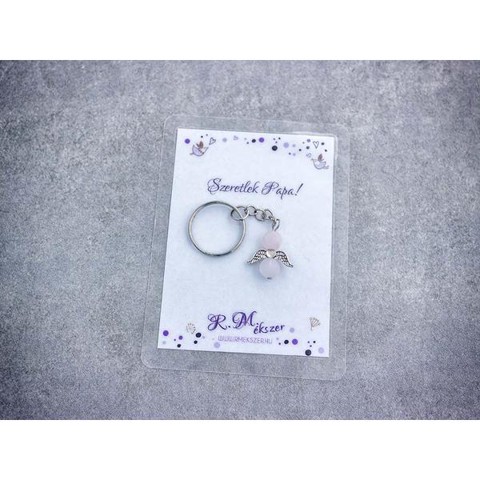 Számotokra állítottunk össze egy kedves meglepetést!"Szeretlek, Papa!"feliratos ajándékkártya rózsakvarc kulcstartóvalA kulcstartót a kártyával együtt kapjátok meg!A köszönő csomag tartalma: 1 db rózsakvarc díszes kulcstartó 1 db köszönő kártyaVan, amikor nehéz szavakat találni, vagy egészen egyszerűen hangok nélkül szeretnénk kifejezni a gondolatainkat, érzéseinket. Ebben segítenek kívánság vagy köszönő kártyáink, melyek a kiválasztott kulcstartóval együtt csodálatos ajándékok lehetnek. A laminált kívánság kártya mérete 110×80 mm.Amit a rózsakvarcról érdemes tudnod:A festetlen rózsakvarc az egész világos, szinte áttetszőtől, a ködös középrózsaszínig terjed. Az egyik legnépszerűbb kövek egyike, amely szépséges küllemének és erős gyógyhatásának köszönhető. Története a görög és római mitológiába nyúlik vissza, amely szerint a rózsakvarc Erósznak és Ámornak a szerelem Isteneinek az emberek felé nyújtott ajándéka.Lelki gyógyhatás:Már tehát az ókoriak is hittek a kő szerelem terén gyakorolt pozitív hatásaiban. A rózsakvarc a szívcsakrán keresztül segít az érzelmi blokádok feloldásában, megnyitja belső kapukat, hogy a csodát, szeretetet és szerelem formájában magunkévá tehessük. Érzelmi blokkok feloldása a szerelem lelki és testi kiteljesedését segíti. Az érzelmi gátak felszabadítása a termékenységet is magában hordozza, így ez a kő terméketlenség esetén is hasznos lehet. A rózsakvarc egyéb területeken is bizonyíthatja pozitív hatásait. Mivel segít megtalálni az életben a szépséget és a szeretet lelki egyensúlyunk helyre billentése és alkotó gondolatok megtalálása terén is hasznunkra lehet ez az ásvány. Használjuk meditáció közben haragunk leküzdéséhez és szeretetünk, szerelmünk kiteljesítéséhez.Testi gyógyhatás:Ez a rózsaszín különlegesség testi bajainkra gyógyírt jelenthet, mint a szívcsakra köve, a bőrbetegségek, asztma, allergia és vérszegénység ellen használhatjuk. Védi és erősíti a szívet, harmonizálja a szívritmust.Hozzárendelt mágikus hatás:Sokak szerint a rózsakvarc nem csak a már meglévő szerelmünk intenzívebbé tételében segíthet, hanem az áhított szerelem megtalálásában, magunkhoz vonzásában is.Csillagjegyei: Bika, Rák, MérlegCsakrája: SzívcsakraFigyelem! Az ásványokat, kristályokat az őskor óta használják a test, a lélek és az érzelmek harmonizálására. Az ókori kultúrákban kifejezetten elterjedtek voltak. Az évezredek alatt számtalan tudás és tapasztalat gyűlt össze róluk. Ásvány ékszereink leírásánál a meghatározó szakirodalom alapján készült összegzések olvashatók. Fontos! Az ásvány ékszerek viselése, az ásványok és kristályok gyógyításban, alternatív terápiaként való használata nem helyettesíti a modern orvostudományt, a gyógyszeres kezelést. Betegség esetén az öngyógyítás helyett kérjük, forduljon szakemberhez!