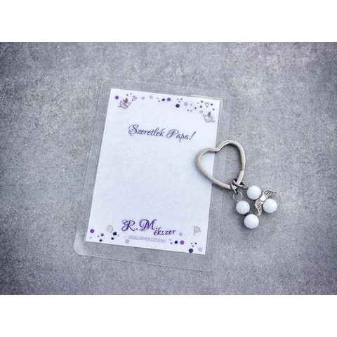 Számotokra állítottunk össze egy kedves meglepetést!"Szeretlek, Papa!"feliratos ajándékkártya tejkvarc kulcstartóvalA kulcstartót a kártyával együtt kapjátok meg!A köszönő csomag tartalma: 1 db tejkvarc díszes kulcstartó 1 db köszönő kártyaVan, amikor nehéz szavakat találni, vagy egészen egyszerűen hangok nélkül szeretnénk kifejezni a gondolatainkat, érzéseinket. Ebben segítenek kívánság vagy köszönő kártyáink, melyek a kiválasztott kulcstartóval együtt csodálatos ajándékok lehetnek. A laminált kívánság kártya mérete 110×80 mm.Amit a tejkvarcról érdemes tudnod:Segít felidézni gyermeki énünket, utat nyit az ártatlanság, a lelkesedés felé. A gyermeki ártatlanság, és előítélet mentes kíváncsiságával fedezhetjük fel újra a világot. Erősíti az életbe vetett hitet, feloldja a szomorúságot, bánatot. Serkenti az empátiát és együttérzést. Rendkívüli nyugtató kő, harmonizálja az energiákat, elűzi a kétségeket, segít a „szívvel” látni. Harmonizáló hatásának köszönhetően csillapítja a hangulatváltozások okozta depresszív érzéseket, segíti a tudatos irányítás kifejlesztését. Stabilizálja a lelki egyensúlyt, kiváló segítség átmeneti időszakokban, mint pl. a változó kor. Segít visszaemlékezni céljaidra, tiszta vágyaidra, melyeket a napi rutin eltompított. Feloldja a korlátokat, segíti a tanulást, szövegértést, javítja a memóriát. Segíti a nyugodt alvást, és kellemes álmokat hoz. Lehet párosítani Rózsakvarccal, vagy Lepidolittal a kellemes, kikapcsolódást segítő pihenés érdekében. A számítógép monitora elé helyezve elnyeli a káros sugárzásokat.Testi gyógyhatások:Segíti a nyugodt, pihentető alvást. Serkenti az immunrendszert, kiegyensúlyozza a csakrák működését. Gyógyhatását kifejti a női ivarszervekre, oldja a szexuális zavarokat.Lelki gyógyhatások:Nyugtató hatásával elősegíti a meditatív állapot elérését, oldja a mentális blokkokat. Kiváló segítség érzelmi blokkok oldásához. Elősegíti a kommunikációt a Felsőbb Énnel és a szellem vezetőkkel.Figyelem! Az ásványokat, kristályokat az őskor óta használják a test, a lélek és az érzelmek harmonizálására. Az ókori kultúrákban kifejezetten elterjedtek voltak. Az évezredek alatt számtalan tudás és tapasztalat gyűlt össze róluk. Ásvány ékszereink leírásánál a meghatározó szakirodalom alapján készült összegzések olvashatók. Fontos! Az ásvány ékszerek viselése, az ásványok és kristályok gyógyításban, alternatív terápiaként való használata nem helyettesíti a modern orvostudományt, a gyógyszeres kezelést. Betegség esetén az öngyógyítás helyett kérjük, forduljon szakemberhez!