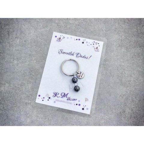 Számotokra állítottunk össze egy kedves meglepetést!"Szeretlek, Dadus!"feliratos ajándékkártya hematit kulcstartóvalA kulcstartót a kártyával együtt kapjátok meg!A köszönő csomag tartalma: 1 db hematit díszes kulcstartó 1 db köszönő kártyaVan, amikor nehéz szavakat találni, vagy egészen egyszerűen hangok nélkül szeretnénk kifejezni a gondolatainkat, érzéseinket. Ebben segítenek kívánság vagy köszönő kártyáink, melyek a kiválasztott kulcstartóval együtt csodálatos ajándékok lehetnek. A laminált kívánság kártya mérete 110×80 mm.Amit a hematitról tudni érdemes:Ez a metálosan csillogó szürkés-barnás kő más néven "vérkőként" is ismertté vált. Ez az elnevezés nem csak testi gyógyhatásai miatt illik rá, hanem mert csiszolásuk során az ember ujját vérpiros színűvé festi. A hematit egy erős energiakő, segítségével a többi ásványi követ is feltölthetjük.Lelki gyógyhatás:A hematit körénk "épít" egy védőkorlátot, amely egyrészt segít bátrabban, céltudatosabban mozogni a világban, másrészt ellenállóbbá tesz a külső befolyásokkal szemben. A hematit fokozza a dinamikánkat, vitalitásunkat, aktiválja az akaraterőnket, javítva ezáltal az életminőségünkön. Mivel aktiváló hatású, így nem ajánlott használata pihenések alkalmával.Testi gyógyhatás:A már említett vöröses színe a magas vastartalmából adódik a kőnek, így igen hatásos a vérrel kapcsolatos betegségekre, így tehát pozitívan hat a vérképre, vérszegénység ellen is jó, kiegyenlíti a vérnyomás ingadozásait. Kiváló érelmeszesedés, lábdagadás, visszerek ellen. Hatására a vérömlenyek sokkal gyorsabban elmúlnak. Aranyér ellen is hatásos. Fokozza a test regenerálódási folyamatait, elősegíti a sebek gyógyulását. Segíti a májfunkciókat, így használatuk különösen ajánlott méregtelenítő kúrák során. Segít a rendszertelen menstruációkon is. Babavárás alatti fáradtság enyhítésére különösen ajánlott.Hozzárendelt mágikus hatás:Szerencsehozó amulettként ismert volt már a régi korokban, Babyloniában pl. segített a tulajdonosának megnyerni mindent pert. Az ősi Egyiptomban a hematitot a halottak feje alá tették, hogy megkönnyítse a lélek útját az örökkévalóságba. Magát Tutanhamont is egy hematitból készült szkarabeusz kísérte a végtelenbe tartó úton. A hematit ezen kívül megvéd a gonosz átkok ellen és óvja álmainkat.Csillagjegyei: Bak, Vízöntő, Kos, SkorpióCsakrája: GyökércsakraFigyelem! Az ásványokat, kristályokat az őskor óta használják a test, a lélek és az érzelmek harmonizálására. Az ókori kultúrákban kifejezetten elterjedtek voltak. Az évezredek alatt számtalan tudás és tapasztalat gyűlt össze róluk. Ásvány ékszereink leírásánál a meghatározó szakirodalom alapján készült összegzések olvashatók. Fontos! Az ásvány ékszerek viselése, az ásványok és kristályok gyógyításban, alternatív terápiaként való használata nem helyettesíti a modern orvostudományt, a gyógyszeres kezelést. Betegség esetén az öngyógyítás helyett kérjük, forduljon szakemberhez!
