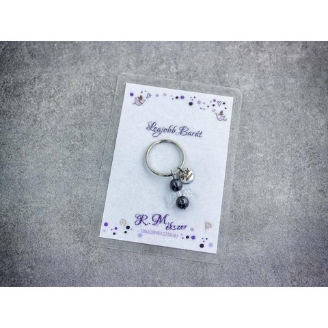 Számotokra állítottunk össze egy kedves meglepetést!"Legjobb barátomnak"feliratos ajándékkártya hematit kulcstartóvalA kulcstartót a kártyával együtt kapjátok meg!A köszönő csomag tartalma: 1 db hematit díszes kulcstartó 1 db köszönő kártyaVan, amikor nehéz szavakat találni, vagy egészen egyszerűen hangok nélkül szeretnénk kifejezni a gondolatainkat, érzéseinket. Ebben segítenek kívánság vagy köszönő kártyáink, melyek a kiválasztott kulcstartóval együtt csodálatos ajándékok lehetnek. A laminált kívánság kártya mérete 110×80 mm.Amit a hematitról tudni érdemes:Ez a metálosan csillogó szürkés-barnás kő más néven "vérkőként" is ismertté vált. Ez az elnevezés nem csak testi gyógyhatásai miatt illik rá, hanem mert csiszolásuk során az ember ujját vérpiros színűvé festi. A hematit egy erős energiakő, segítségével a többi ásványi követ is feltölthetjük.Lelki gyógyhatás:A hematit körénk "épít" egy védőkorlátot, amely egyrészt segít bátrabban, céltudatosabban mozogni a világban, másrészt ellenállóbbá tesz a külső befolyásokkal szemben. A hematit fokozza a dinamikánkat, vitalitásunkat, aktiválja az akaraterőnket, javítva ezáltal az életminőségünkön. Mivel aktiváló hatású, így nem ajánlott használata pihenések alkalmával.Testi gyógyhatás:A már említett vöröses színe a magas vastartalmából adódik a kőnek, így igen hatásos a vérrel kapcsolatos betegségekre, így tehát pozitívan hat a vérképre, vérszegénység ellen is jó, kiegyenlíti a vérnyomás ingadozásait. Kiváló érelmeszesedés, lábdagadás, visszerek ellen. Hatására a vérömlenyek sokkal gyorsabban elmúlnak. Aranyér ellen is hatásos. Fokozza a test regenerálódási folyamatait, elősegíti a sebek gyógyulását. Segíti a májfunkciókat, így használatuk különösen ajánlott méregtelenítő kúrák során. Segít a rendszertelen menstruációkon is. Babavárás alatti fáradtság enyhítésére különösen ajánlott.Hozzárendelt mágikus hatás:Szerencsehozó amulettként ismert volt már a régi korokban, Babyloniában pl. segített a tulajdonosának megnyerni mindent pert. Az ősi Egyiptomban a hematitot a halottak feje alá tették, hogy megkönnyítse a lélek útját az örökkévalóságba. Magát Tutanhamont is egy hematitból készült szkarabeusz kísérte a végtelenbe tartó úton. A hematit ezen kívül megvéd a gonosz átkok ellen és óvja álmainkat.Csillagjegyei: Bak, Vízöntő, Kos, SkorpióCsakrája: GyökércsakraFigyelem! Az ásványokat, kristályokat az őskor óta használják a test, a lélek és az érzelmek harmonizálására. Az ókori kultúrákban kifejezetten elterjedtek voltak. Az évezredek alatt számtalan tudás és tapasztalat gyűlt össze róluk. Ásvány ékszereink leírásánál a meghatározó szakirodalom alapján készült összegzések olvashatók. Fontos! Az ásvány ékszerek viselése, az ásványok és kristályok gyógyításban, alternatív terápiaként való használata nem helyettesíti a modern orvostudományt, a gyógyszeres kezelést. Betegség esetén az öngyógyítás helyett kérjük, forduljon szakemberhez!