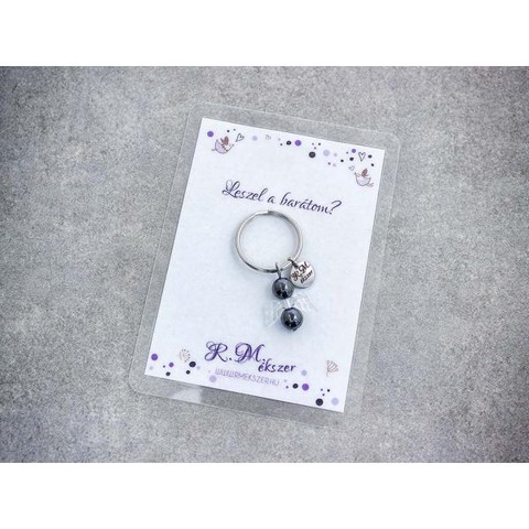 Számotokra állítottunk össze egy kedves meglepetést!"Leszel a barátom?"feliratos ajándékkártya hematit kulcstartóvalA kulcstartót a kártyával együtt kapjátok meg!A köszönő csomag tartalma: 1 db hematit díszes kulcstartó 1 db köszönő kártyaVan, amikor nehéz szavakat találni, vagy egészen egyszerűen hangok nélkül szeretnénk kifejezni a gondolatainkat, érzéseinket. Ebben segítenek kívánság vagy köszönő kártyáink, melyek a kiválasztott kulcstartóval együtt csodálatos ajándékok lehetnek. A laminált kívánság kártya mérete 110×80 mm.Amit a hematitról tudni érdemes:Ez a metálosan csillogó szürkés-barnás kő más néven "vérkőként" is ismertté vált. Ez az elnevezés nem csak testi gyógyhatásai miatt illik rá, hanem mert csiszolásuk során az ember ujját vérpiros színűvé festi. A hematit egy erős energiakő, segítségével a többi ásványi követ is feltölthetjük.Lelki gyógyhatás:A hematit körénk "épít" egy védőkorlátot, amely egyrészt segít bátrabban, céltudatosabban mozogni a világban, másrészt ellenállóbbá tesz a külső befolyásokkal szemben. A hematit fokozza a dinamikánkat, vitalitásunkat, aktiválja az akaraterőnket, javítva ezáltal az életminőségünkön. Mivel aktiváló hatású, így nem ajánlott használata pihenések alkalmával.Testi gyógyhatás:A már említett vöröses színe a magas vastartalmából adódik a kőnek, így igen hatásos a vérrel kapcsolatos betegségekre, így tehát pozitívan hat a vérképre, vérszegénység ellen is jó, kiegyenlíti a vérnyomás ingadozásait. Kiváló érelmeszesedés, lábdagadás, visszerek ellen. Hatására a vérömlenyek sokkal gyorsabban elmúlnak. Aranyér ellen is hatásos. Fokozza a test regenerálódási folyamatait, elősegíti a sebek gyógyulását. Segíti a májfunkciókat, így használatuk különösen ajánlott méregtelenítő kúrák során. Segít a rendszertelen menstruációkon is. Babavárás alatti fáradtság enyhítésére különösen ajánlott.Hozzárendelt mágikus hatás:Szerencsehozó amulettként ismert volt már a régi korokban, Babyloniában pl. segített a tulajdonosának megnyerni mindent pert. Az ősi Egyiptomban a hematitot a halottak feje alá tették, hogy megkönnyítse a lélek útját az örökkévalóságba. Magát Tutanhamont is egy hematitból készült szkarabeusz kísérte a végtelenbe tartó úton. A hematit ezen kívül megvéd a gonosz átkok ellen és óvja álmainkat.Csillagjegyei: Bak, Vízöntő, Kos, SkorpióCsakrája: GyökércsakraFigyelem! Az ásványokat, kristályokat az őskor óta használják a test, a lélek és az érzelmek harmonizálására. Az ókori kultúrákban kifejezetten elterjedtek voltak. Az évezredek alatt számtalan tudás és tapasztalat gyűlt össze róluk. Ásvány ékszereink leírásánál a meghatározó szakirodalom alapján készült összegzések olvashatók. Fontos! Az ásvány ékszerek viselése, az ásványok és kristályok gyógyításban, alternatív terápiaként való használata nem helyettesíti a modern orvostudományt, a gyógyszeres kezelést. Betegség esetén az öngyógyítás helyett kérjük, forduljon szakemberhez!