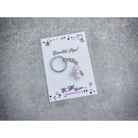 Számotokra állítottunk össze egy kedves meglepetést!"Szeretlek, Apa!"feliratos ajándékkártya rózsakvarc kulcstartóvalA kulcstartót a kártyával együtt kapjátok meg!A köszönő csomag tartalma: 1 db rózsakvarc díszes kulcstartó 1 db köszönő kártyaVan, amikor nehéz szavakat találni, vagy egészen egyszerűen hangok nélkül szeretnénk kifejezni a gondolatainkat, érzéseinket. Ebben segítenek kívánság vagy köszönő kártyáink, melyek a kiválasztott kulcstartóval együtt csodálatos ajándékok lehetnek. A laminált kívánság kártya mérete 110×80 mm.Amit a rózsakvarcról érdemes tudnod:A festetlen rózsakvarc az egész világos, szinte áttetszőtől, a ködös középrózsaszínig terjed. Az egyik legnépszerűbb kövek egyike, amely szépséges küllemének és erős gyógyhatásának köszönhető. Története a görög és római mitológiába nyúlik vissza, amely szerint a rózsakvarc Erósznak és Ámornak a szerelem Isteneinek az emberek felé nyújtott ajándéka.Lelki gyógyhatás:Már tehát az ókoriak is hittek a kő szerelem terén gyakorolt pozitív hatásaiban. A rózsakvarc a szívcsakrán keresztül segít az érzelmi blokádok feloldásában, megnyitja belső kapukat, hogy a csodát, szeretetet és szerelem formájában magunkévá tehessük. Érzelmi blokkok feloldása a szerelem lelki és testi kiteljesedését segíti. Az érzelmi gátak felszabadítása a termékenységet is magában hordozza, így ez a kő terméketlenség esetén is hasznos lehet. A rózsakvarc egyéb területeken is bizonyíthatja pozitív hatásait. Mivel segít megtalálni az életben a szépséget és a szeretet lelki egyensúlyunk helyre billentése és alkotó gondolatok megtalálása terén is hasznunkra lehet ez az ásvány. Használjuk meditáció közben haragunk leküzdéséhez és szeretetünk, szerelmünk kiteljesítéséhez.Testi gyógyhatás:Ez a rózsaszín különlegesség testi bajainkra gyógyírt jelenthet, mint a szívcsakra köve, a bőrbetegségek, asztma, allergia és vérszegénység ellen használhatjuk. Védi és erősíti a szívet, harmonizálja a szívritmust.Hozzárendelt mágikus hatás:Sokak szerint a rózsakvarc nem csak a már meglévő szerelmünk intenzívebbé tételében segíthet, hanem az áhított szerelem megtalálásában, magunkhoz vonzásában is.Csillagjegyei: Bika, Rák, MérlegCsakrája: SzívcsakraFigyelem! Az ásványokat, kristályokat az őskor óta használják a test, a lélek és az érzelmek harmonizálására. Az ókori kultúrákban kifejezetten elterjedtek voltak. Az évezredek alatt számtalan tudás és tapasztalat gyűlt össze róluk. Ásvány ékszereink leírásánál a meghatározó szakirodalom alapján készült összegzések olvashatók. Fontos! Az ásvány ékszerek viselése, az ásványok és kristályok gyógyításban, alternatív terápiaként való használata nem helyettesíti a modern orvostudományt, a gyógyszeres kezelést. Betegség esetén az öngyógyítás helyett kérjük, forduljon szakemberhez!