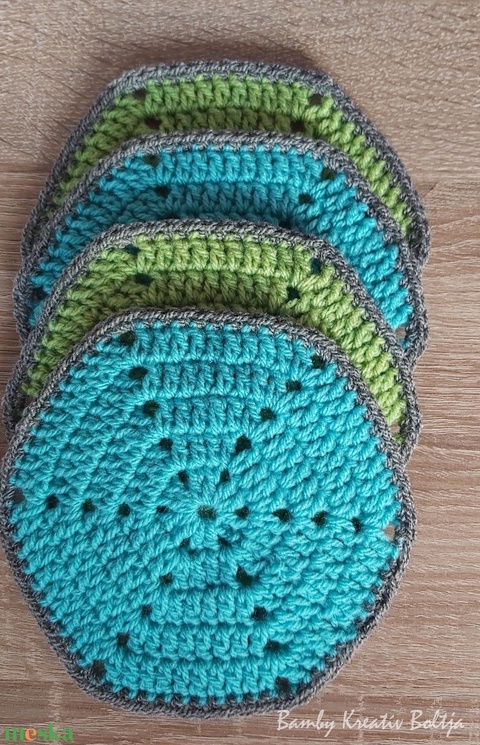 Horgolt poháralátét zöld és türkiz színű