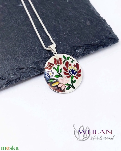 Tradició - Virágoskertem, népi motívumú ezüst tűzzománc medál, kisebb méret