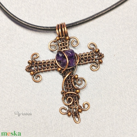 Asszimetrikus kereszt vörösrézréz medál ametiszt ásványokkal