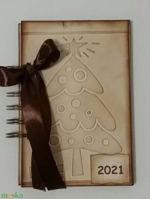 - Anyaga: karton, lemezkarton, ragasztó, fém spirál, szatén szalag, domborító, tinta
