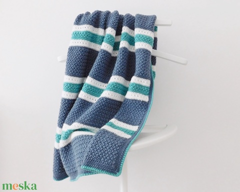 Csíkos horgolt nagyméretű babatakaró, szürke-fehér-türkiz kisfiú takaró