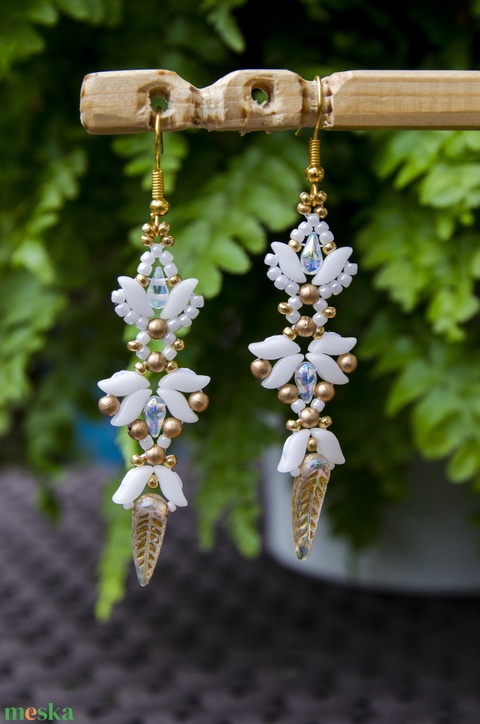 - Anyaga: stormduo, cseh 3mm csiszolt gyöngy, miyuki kásagyöngy, toho kásagyöngy, miyuki cérna, fülbevaló alap, cseh préselt toll gyöngy
