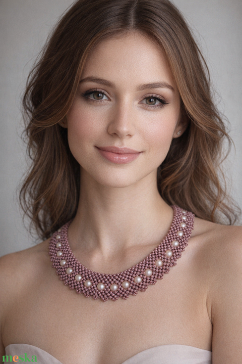 Mályva fémmentes gyöngyfűzött nyakék beige teklagyönggyel
