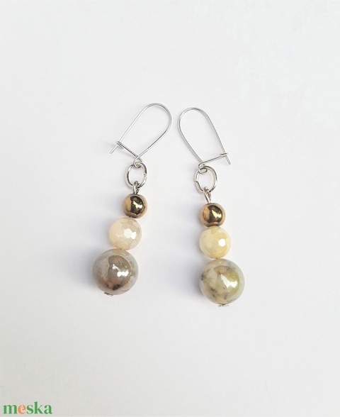 Egy 10 mm-es merlinit aura golyóból, egy db 8 mm-es fazettált holdkő gyöngyből, valamint egy hematit szemből készítettem ezt a különleges hatású fülbevalót.