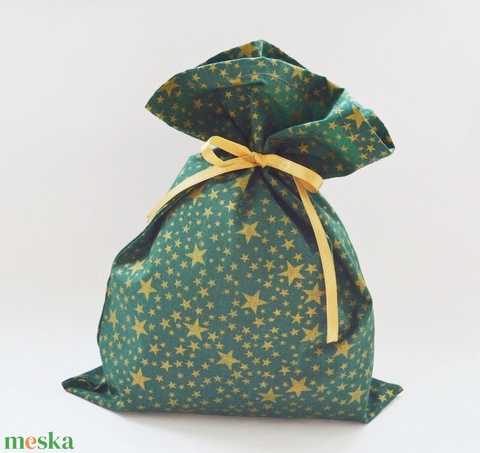 Ajándékzsák, mikulászsák, textilzsák - zöld, arany csillagokkal