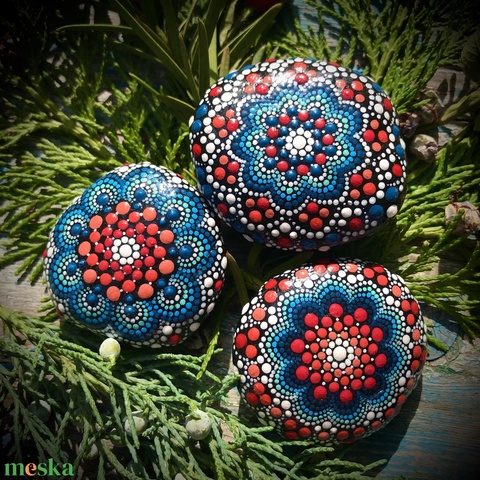 Szeretettel ajánlom Neked kedvenc alkotásaim egyikét, e 3 kék-piros pontozott mandala követ. Egyedi és kreatív Mandala ajándékötlet, de különleges otthoni Mandala dekorációnak is tökéletes.