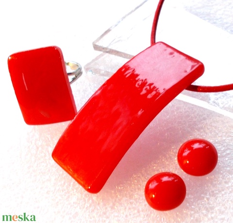 Hajlított piros ékszerszett, díszdobozba csomagolva.