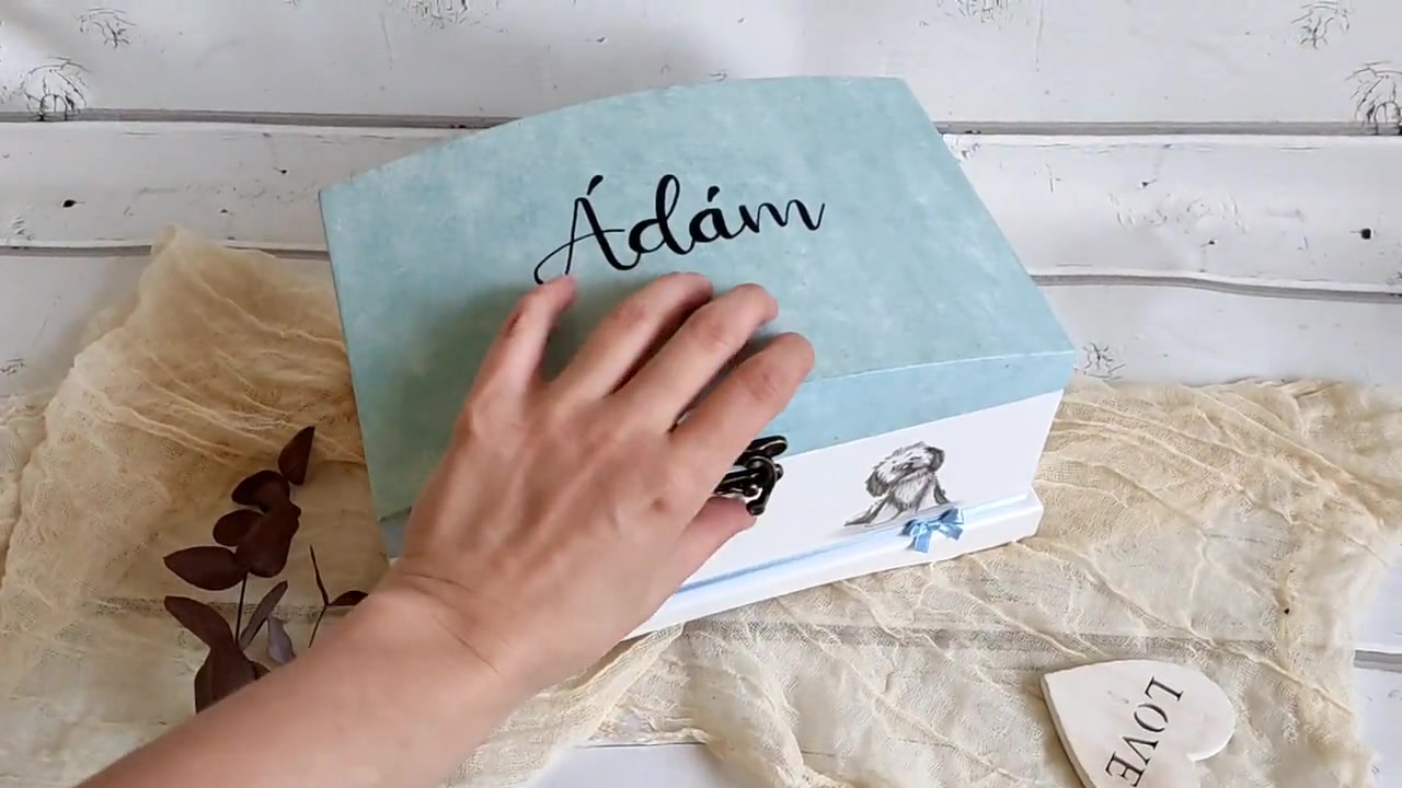 - Anyaga: vízbázisú lakk, faláda, fapác, akrilfestékek, szaténszalag, doboz, fa, lakat