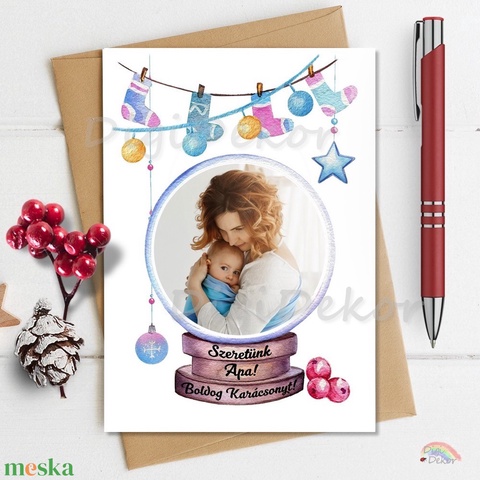 Hógömbös karácsonyi képeslap fényképpel, felirattal. Személyes üdvözlőlap karácsonyra. Nyitható lap.