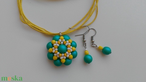 Gyöngy medálos nyaklánc fülbevalóval - zöld-citrom-fehér