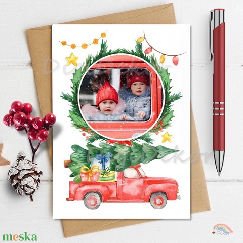 Karácsonyi képeslap fényképpel, felirattal. Piros autós, egyedi kártya, személyes üdvözlőlap karácsonyra.