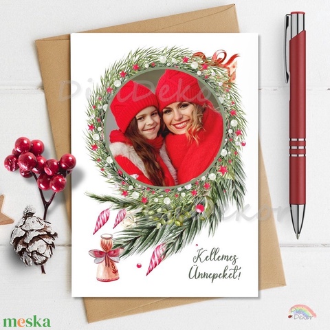 Kellemes ünnepeket! feliratos, fényképes karácsonyi képeslap. Nyitható üdvözlőkártya borítékkal. Egyedi, fotós képeslap.