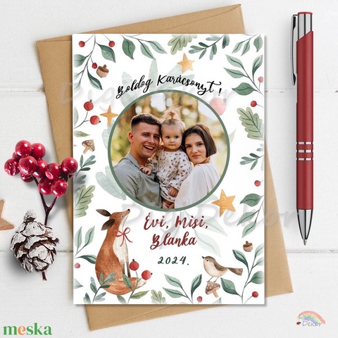 Névre szóló, fényképes karácsonyi képeslap kedves, rókás grafikával. Egyedi üdvözlőlap.