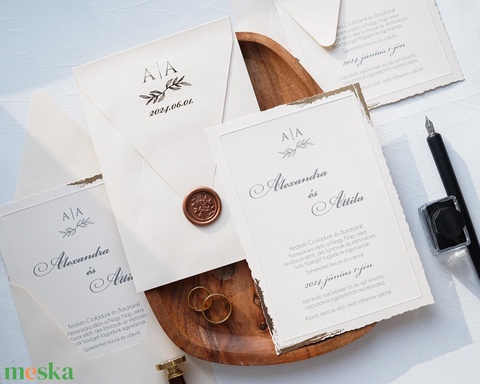 Aranyozott szélű esküvői meghívó különleges krém borítékkal és viaszpecséttel.