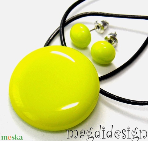 AKCIÓ!! Élénk neonzöld, kerek üvegékszer szett, nyaklánc, fülbevaló